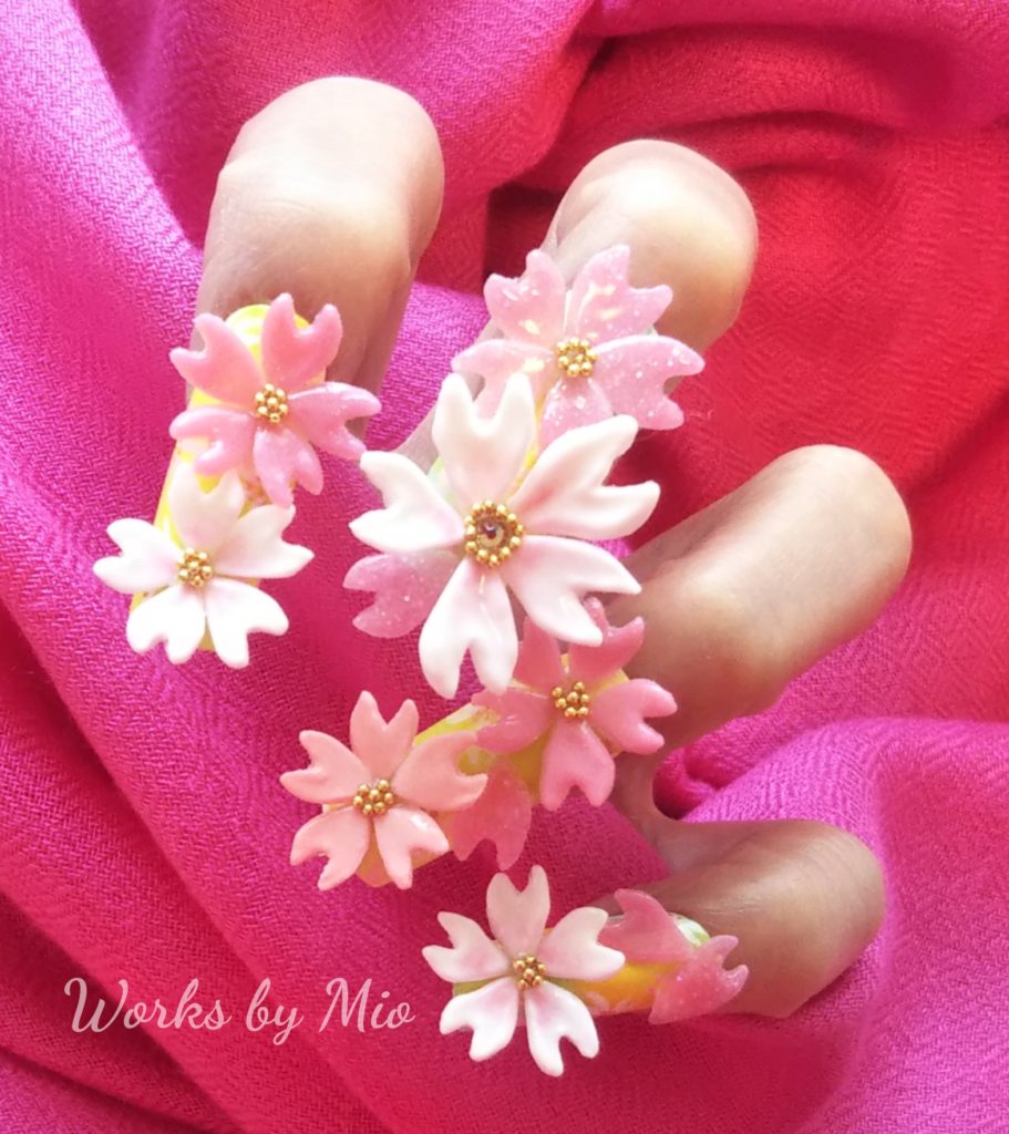ジェルで作った立体パーツを組み合わせた、桜ネイルです。